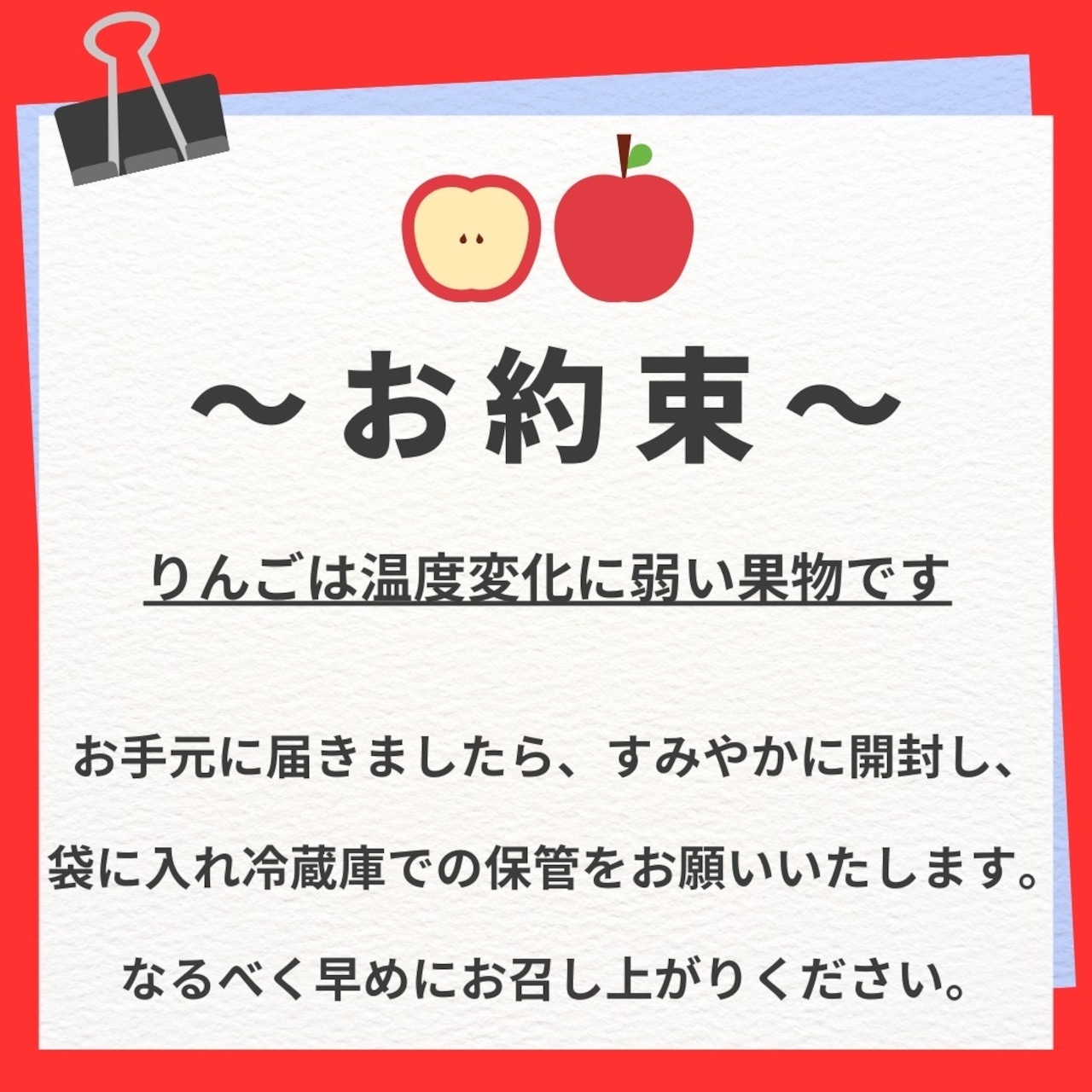 ※りんごは非常に温度変化に弱い果物です。お届け後は必ず冷蔵庫で保管し、できる限りお早めにお召し上がりくださいますようお願い致します。